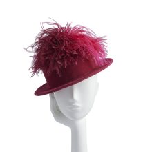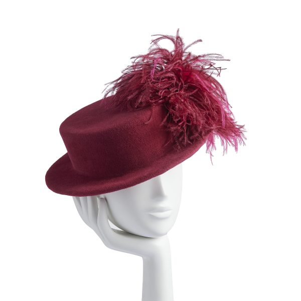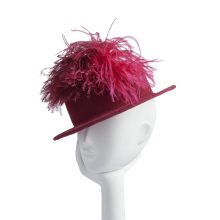 Velour felt short brimmed boater hat. Detachable ostrich brooch.