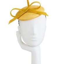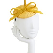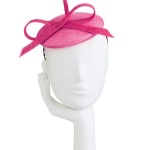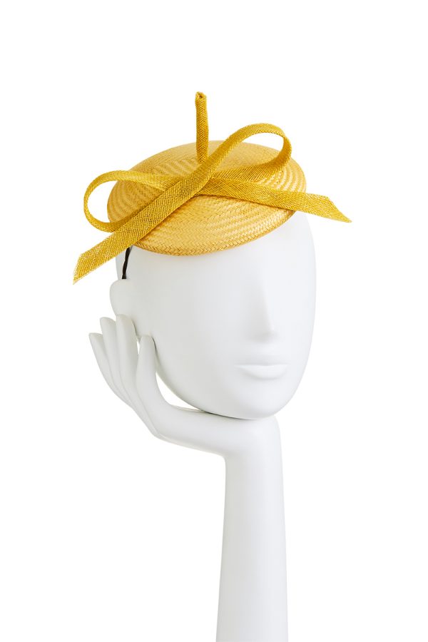 Straw mini beret with bow on headband.