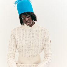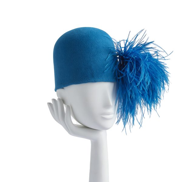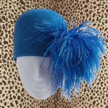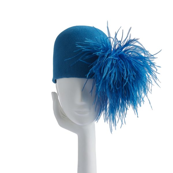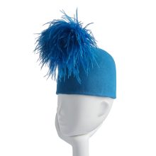 Tall velour felt toque with detachable ostrich brooch. Available other colours.